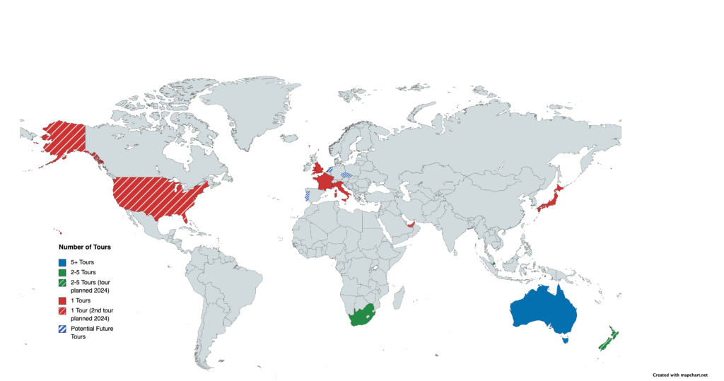 From 2014 – 2023, Cavaliers have run 26 tours, both around Australia and around the world.